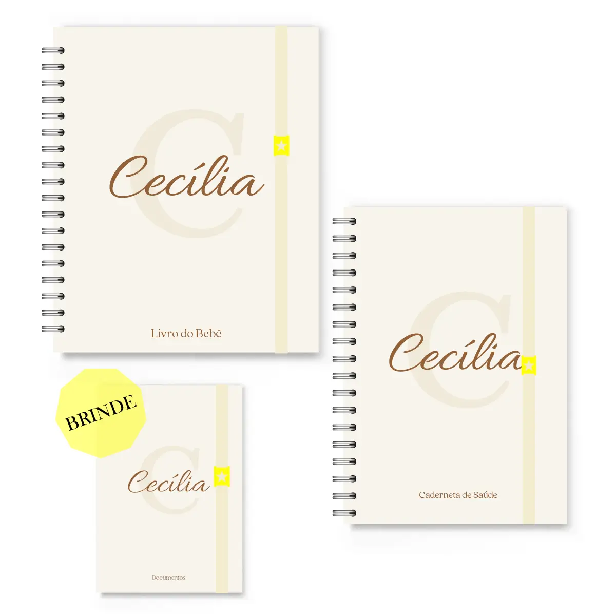 Todos os itens são personalizados com o nome do bebê na capa, tornando o conjunto único e ideal para presente de maternidade ou chá de bebê.