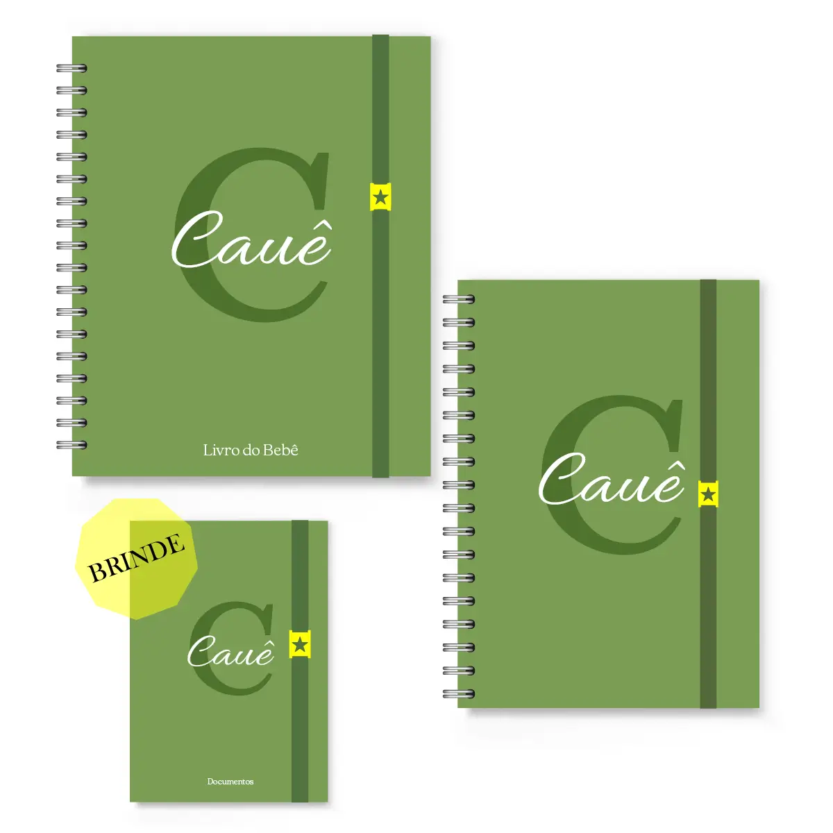 Todos os itens são personalizados com o nome do bebê na capa, tornando o conjunto único e ideal para presente de maternidade ou chá de bebê.