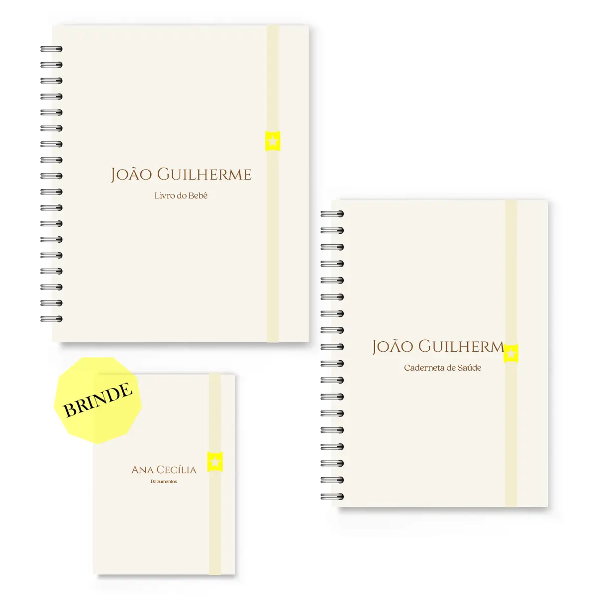 Todos os itens são personalizados com o nome do bebê na capa, tornando o conjunto único e ideal para presente de maternidade ou chá de bebê.