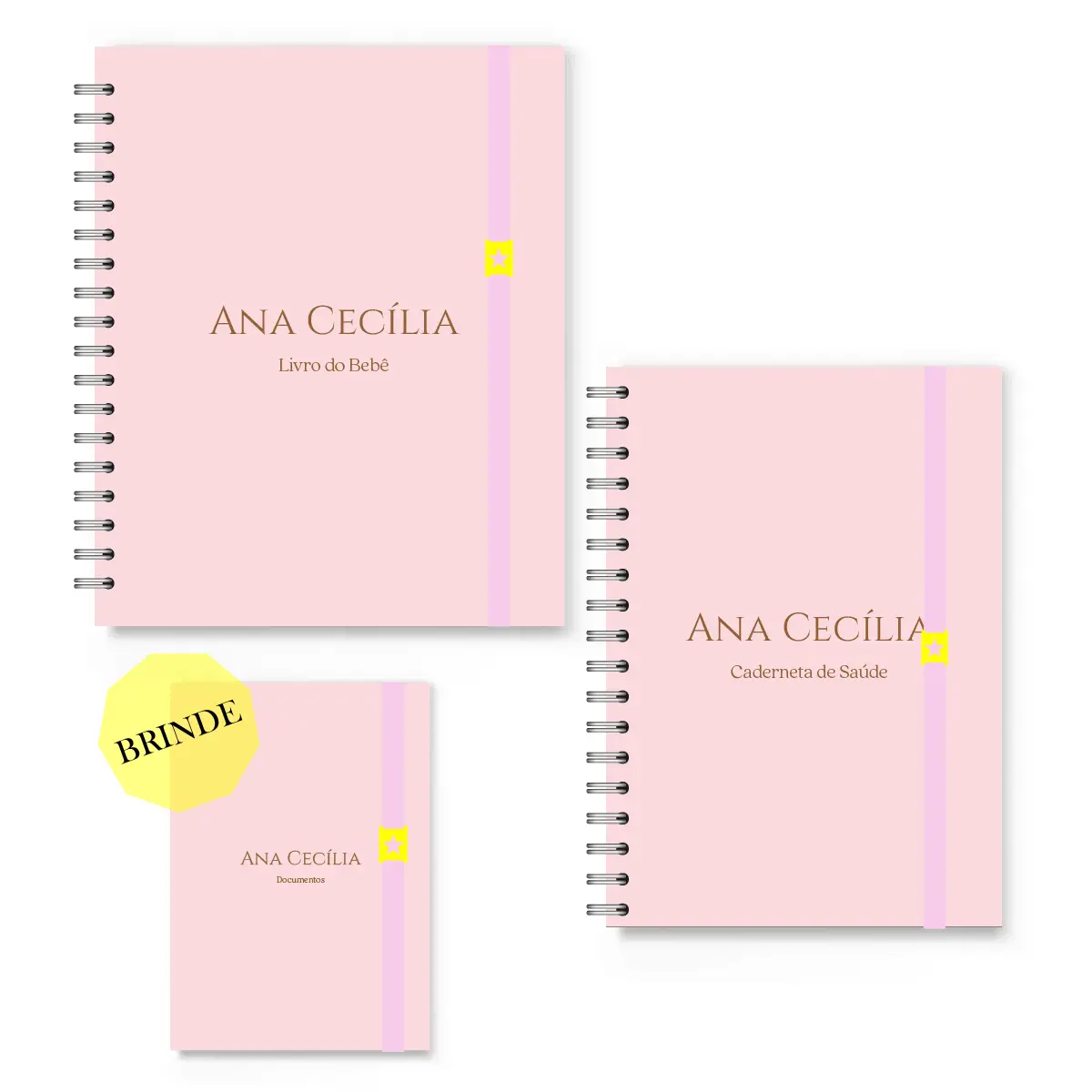 Todos os itens são personalizados com o nome do bebê na capa, tornando o conjunto único e ideal para presente de maternidade ou chá de bebê.