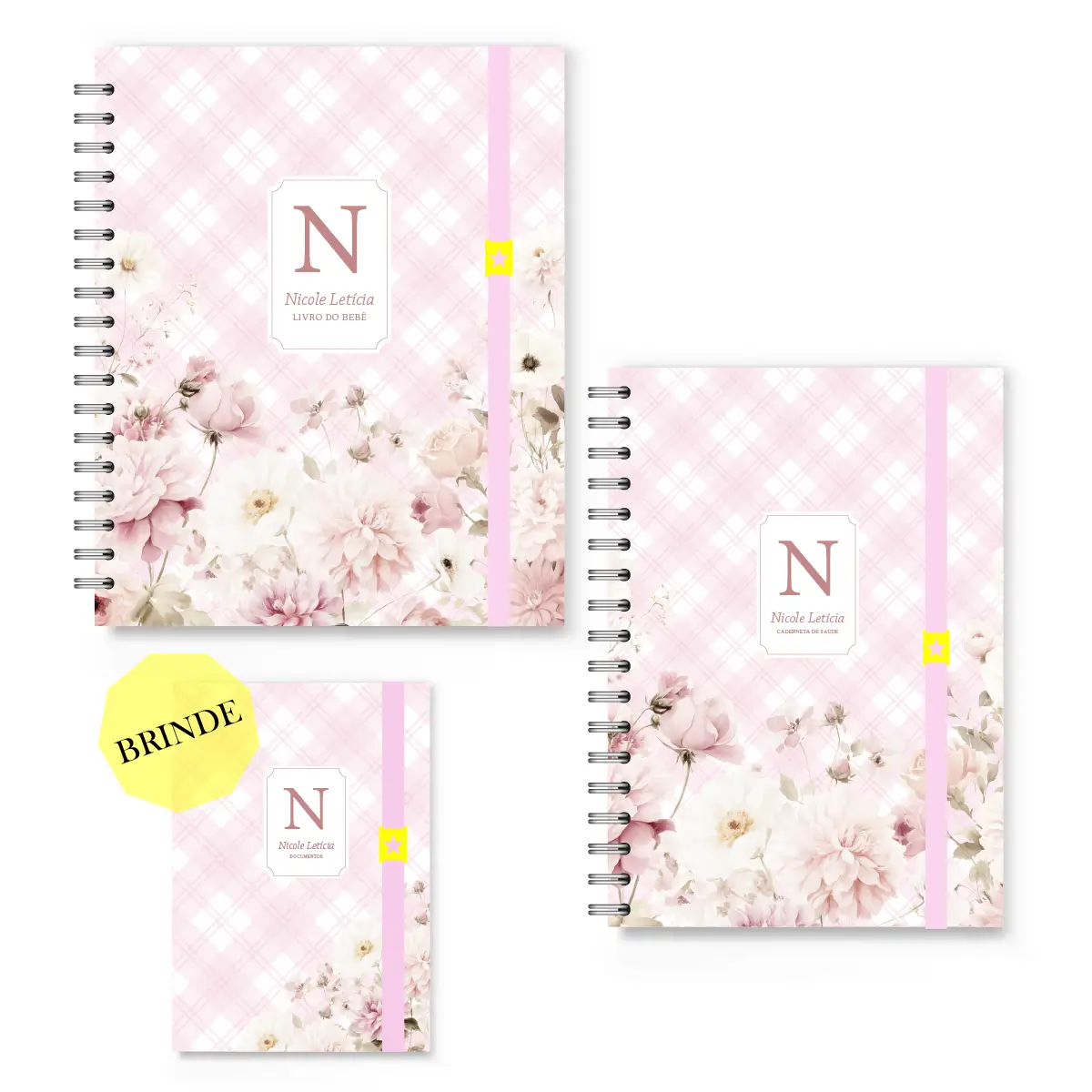 Todos os itens são personalizados com o nome do bebê na capa, tornando o conjunto único e ideal para presente de maternidade ou chá de bebê.