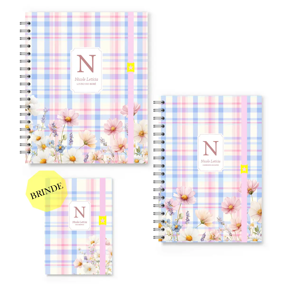 Todos os itens são personalizados com o nome do bebê na capa, tornando o conjunto único e ideal para presente de maternidade ou chá de bebê.